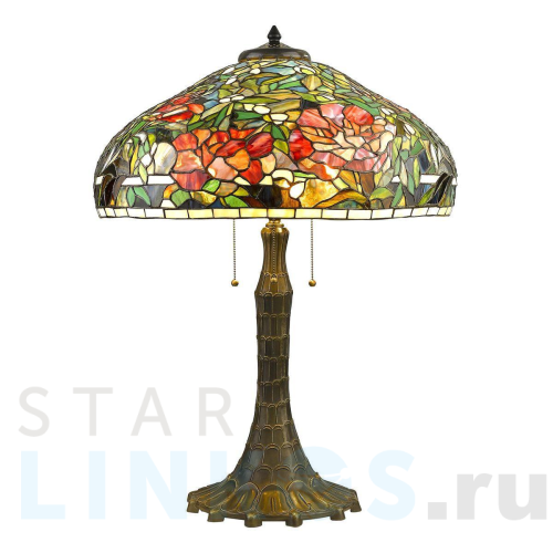 Поставщик рекомендует использовать лампы накаливания с цоколем E27 для освещения площади 9 м2. Настольная лампа Velante 868-804-03 в стиле Тиффани используется в интерьере спальни с установкой на стол.