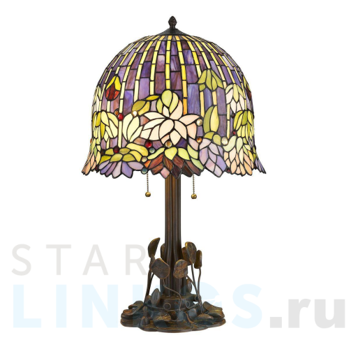 Поставщик рекомендует использовать лампы накаливания с цоколем E27 для освещения площади 6 м2. Настольная лампа Velante 883-804-02 в стиле Тиффани используется в интерьере спальни с установкой на стол.