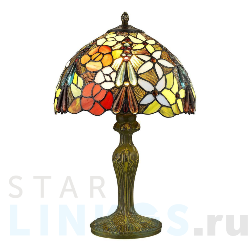 Поставщик рекомендует использовать лампы накаливания с цоколем E27 для освещения площади 3 м2. Настольная лампа Velante 885-804-01 в стиле Тиффани используется в интерьере кухни с установкой на стол.