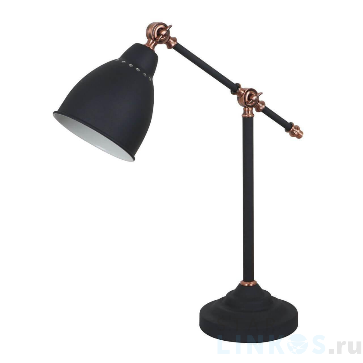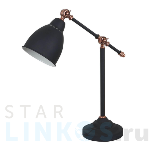 Поставщик рекомендует использовать лампы накаливания с цоколем E27 для освещения площади 3,3 м2. Настольная лампа Arte Lamp Braccio A2054LT-1BK в используется в интерьере офиса с установкой на стол.