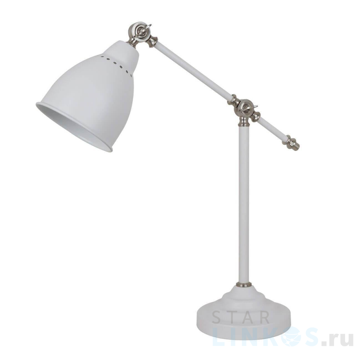 Поставщик рекомендует использовать лампы накаливания с цоколем E27 для освещения площади 3,3 м2. Настольная лампа Arte Lamp Braccio A2054LT-1WH в используется в интерьере офиса с установкой на стол.