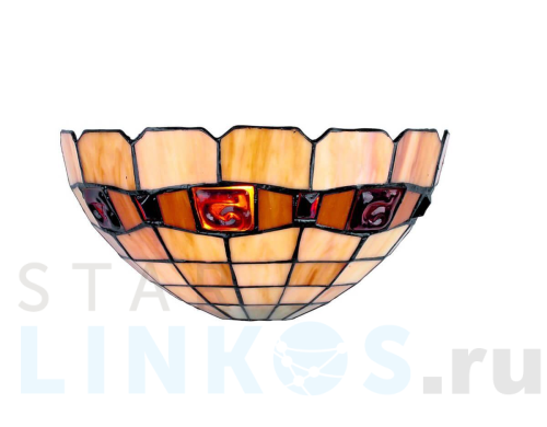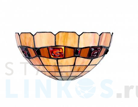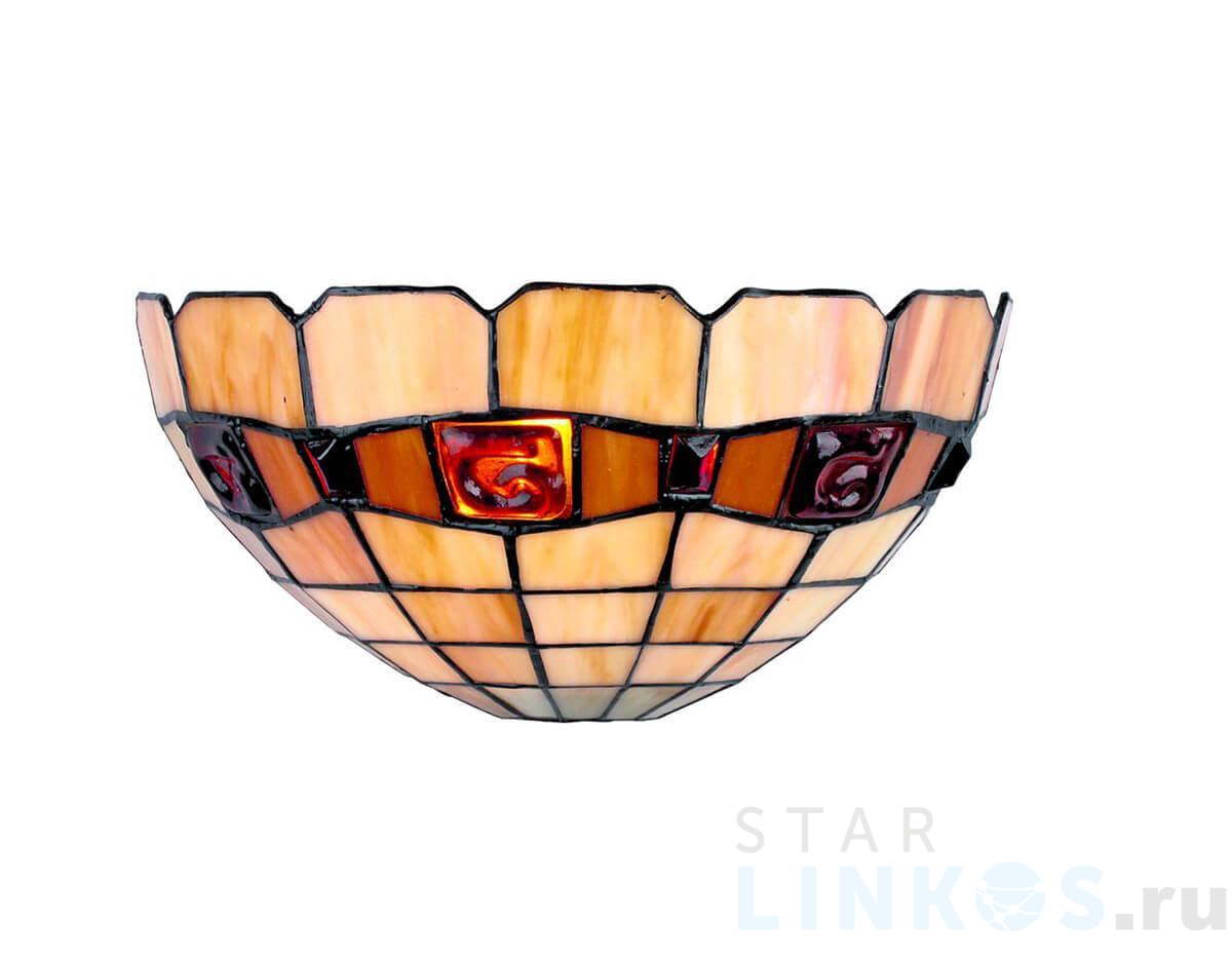 Поставщик рекомендует использовать лампы накаливания с цоколем E14 для освещения площади 2,2 м2. Настенный светильник Omnilux OML-80501-01 в стиле Тиффани используется в интерьере кухни с установкой на стену.