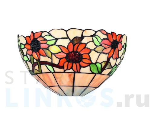 Поставщик рекомендует использовать лампы накаливания с цоколем E14 для освещения площади 2,2 м2. Настенный светильник Omnilux OML-80701-01 в стиле Тиффани используется в интерьере кухни с установкой на стену.