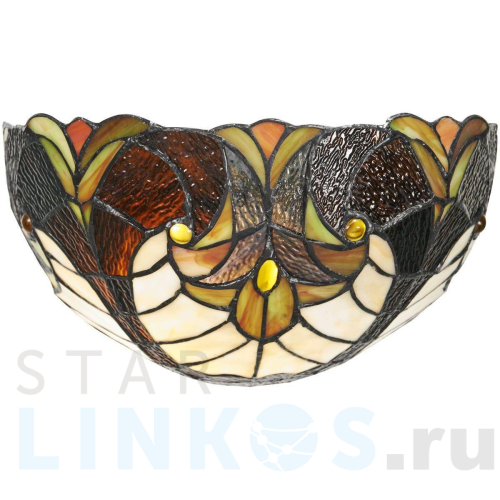 Поставщик рекомендует использовать лампы накаливания с цоколем E14 для освещения площади 2,2 м2. Настенный светильник Velante 815-801-01 в стиле Тиффани используется в интерьере гостиной с установкой на стену.