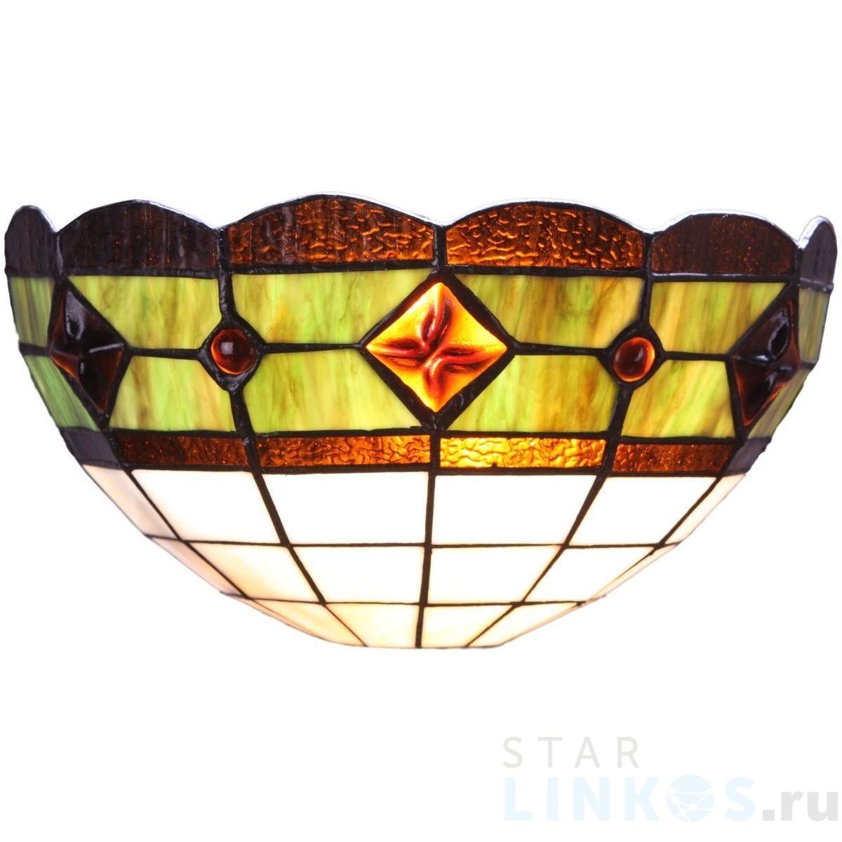 Поставщик рекомендует использовать лампы накаливания с цоколем E27 для освещения площади 2,2 м2. Настенный светильник Velante 855-801-01 в стиле Тиффани используется в интерьере кухни с установкой на стену.