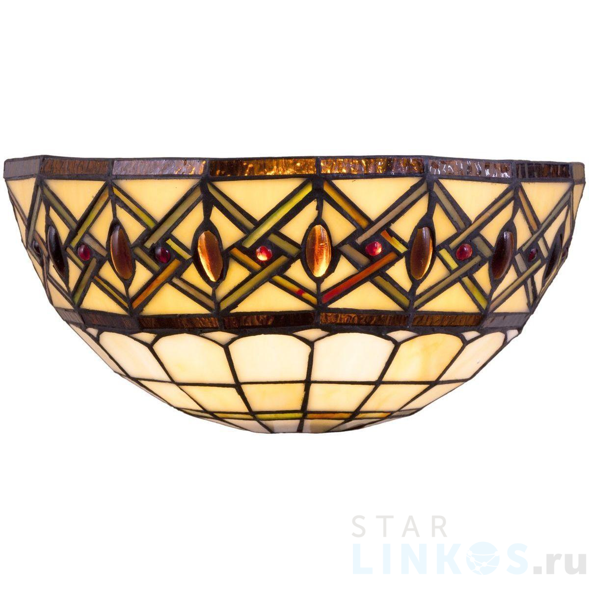Поставщик рекомендует использовать лампы накаливания с цоколем E27 для освещения площади 2,2 м2. Настенный светильник Velante 859-801-01 в стиле Тиффани используется в интерьере спальни с установкой на стену.