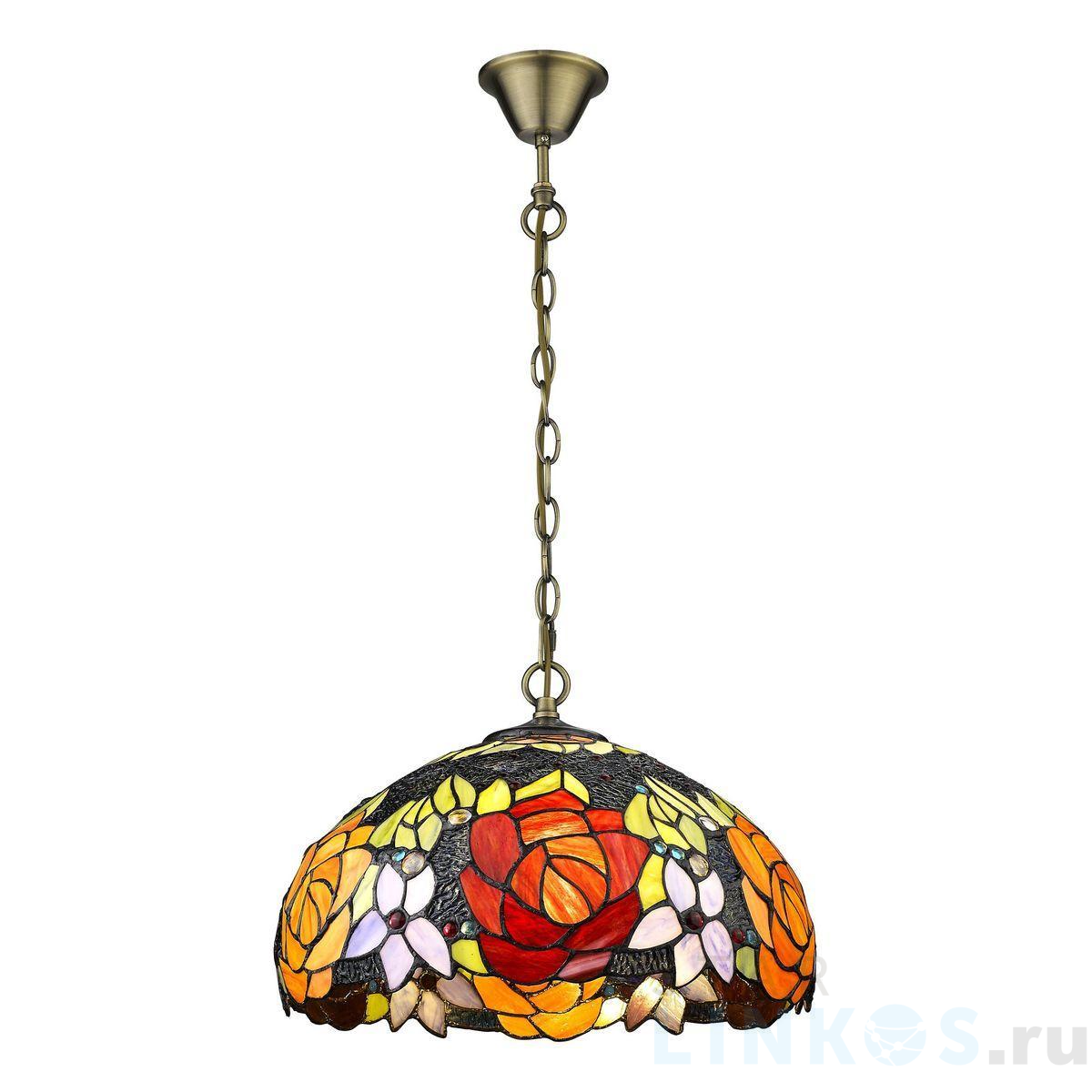 Поставщик рекомендует использовать лампы накаливания с цоколем E27 для освещения площади 6 м2. Подвесной светильник Velante 828-806-02 в стиле Тиффани используется в интерьере кухни с установкой на потолок.