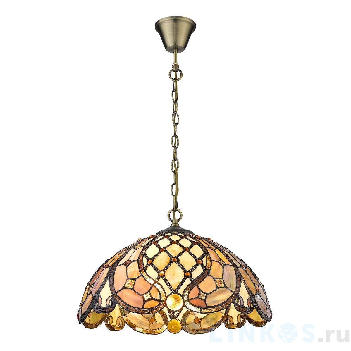Поставщик рекомендует использовать лампы накаливания с цоколем E27 для освещения площади 6 м2. Подвесной светильник Velante 865-806-02 в стиле Тиффани используется в интерьере кухни с установкой на потолок.