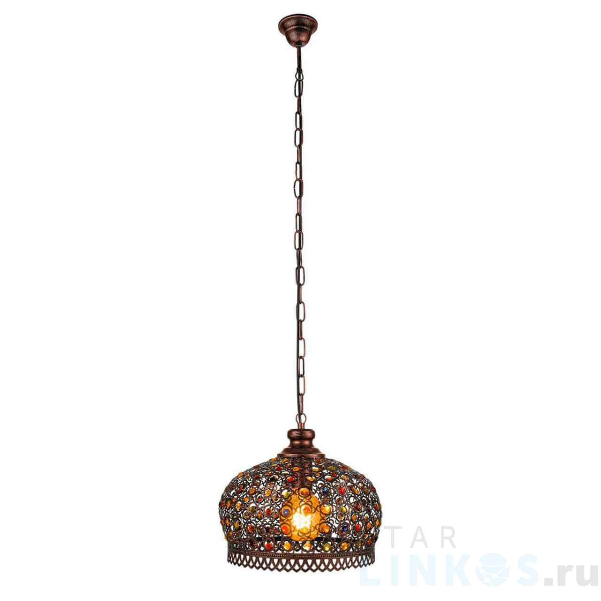 Поставщик рекомендует использовать лампы накаливания с цоколем E27 для освещения площади 3,3 м2. Подвесной светильник Eglo Jadida 49764 в восточном стиле используется в интерьере прихожей с установкой на потолок.