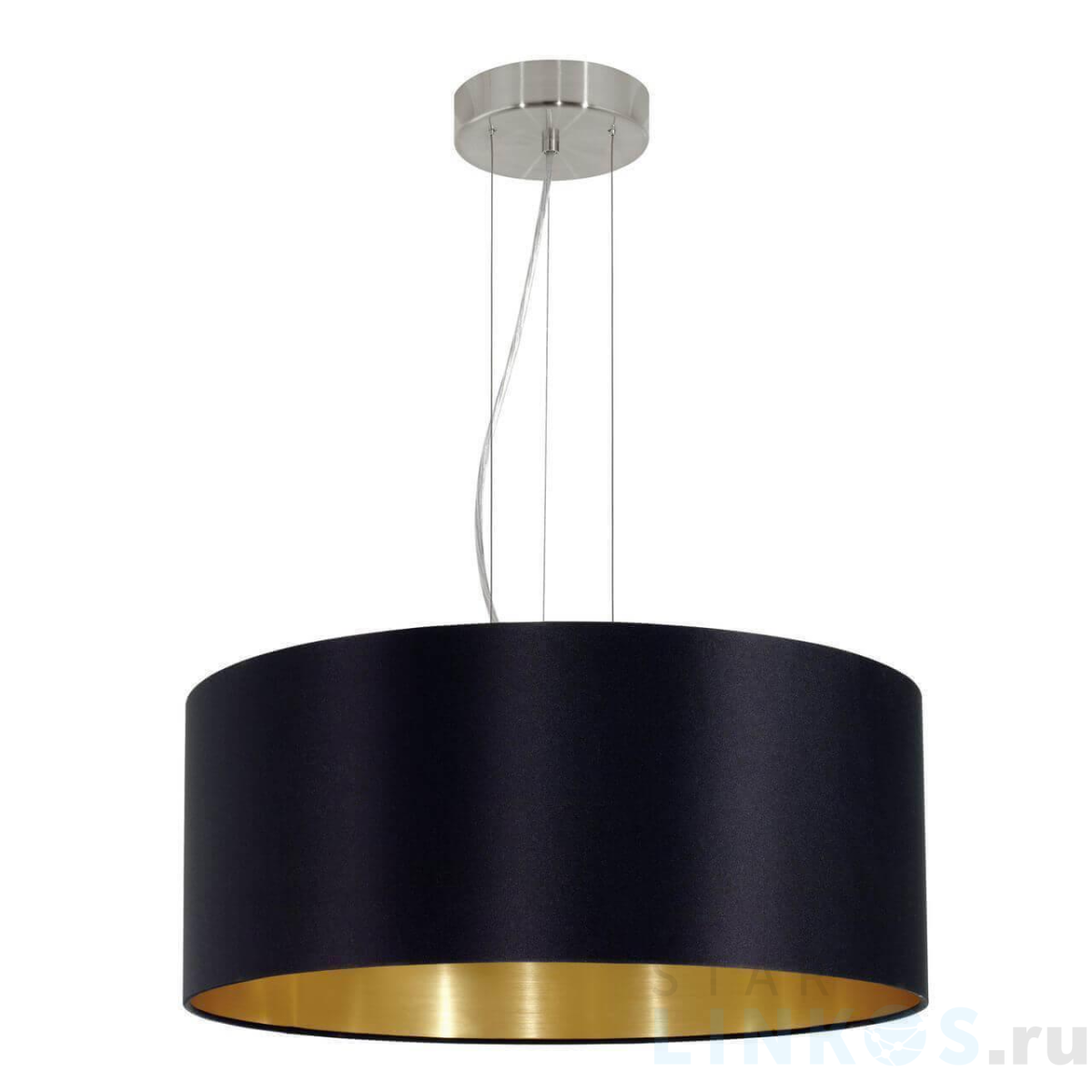 Поставщик рекомендует использовать лампы накаливания с цоколем E27 для освещения площади 10 м2. Подвесной светильник Eglo Maserlo 31605 в современном стиле используется в интерьере кафе и ресторанов с установкой на потолок.