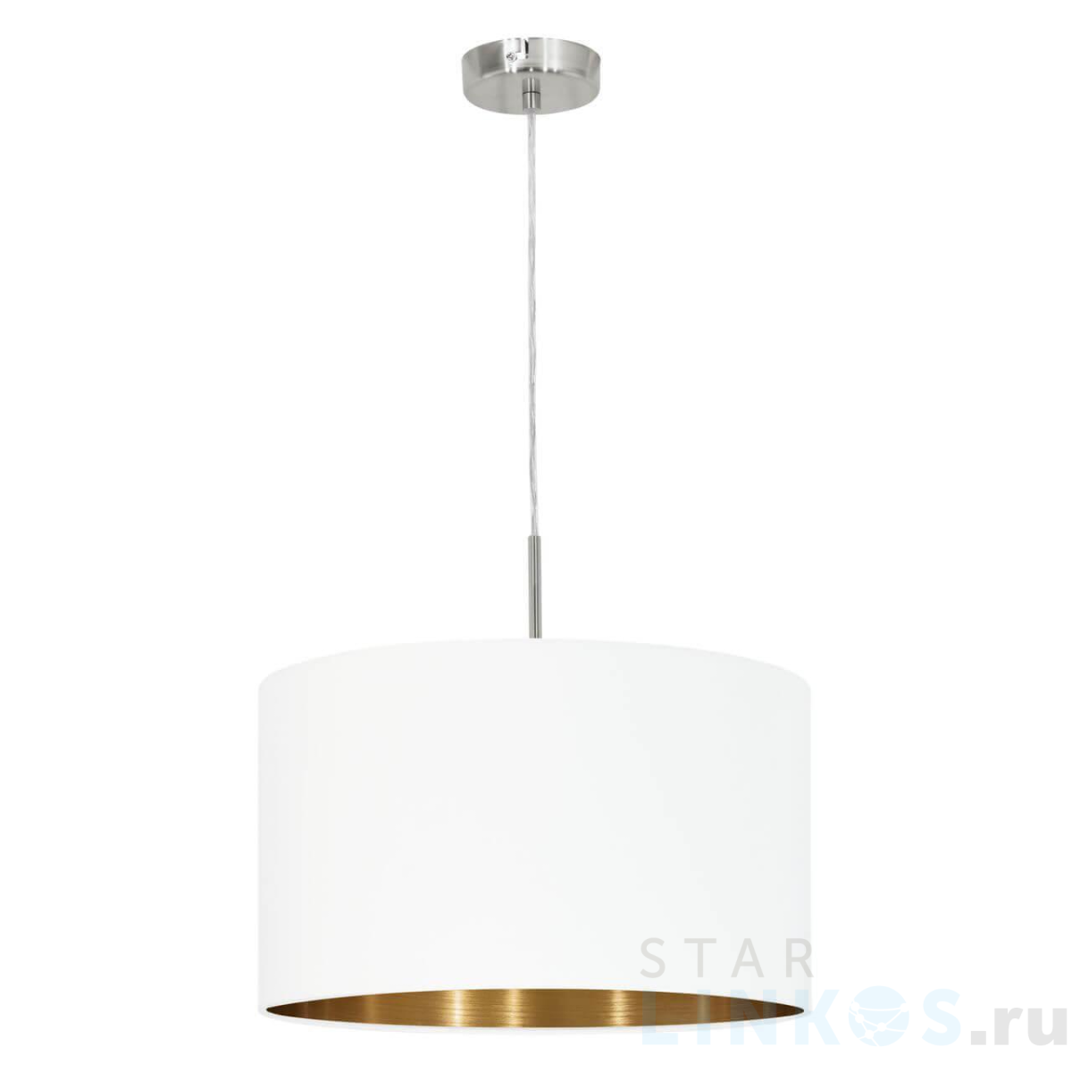 Поставщик рекомендует использовать лампы накаливания с цоколем E27 для освещения площади 3,3 м2. Подвесной светильник Eglo Pasteri 95044 в используется в интерьере спальни с установкой на потолок.