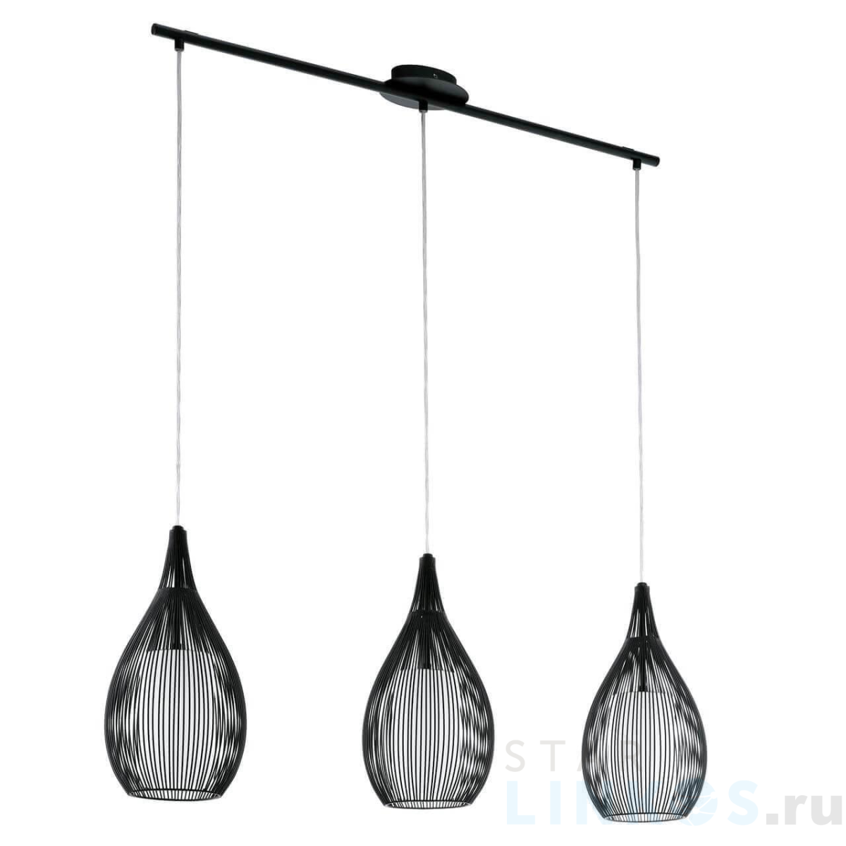 Поставщик рекомендует использовать лампы накаливания с цоколем E27 для освещения площади 10 м2. Подвесной светильник Eglo Razoni 94389 в современном стиле используется в интерьере кухни с установкой на потолок.