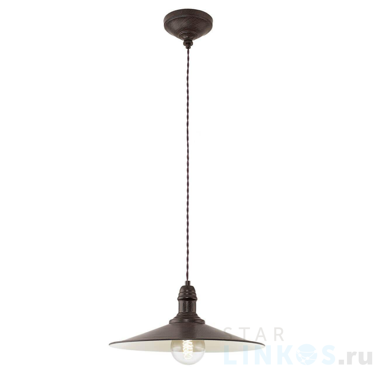 Поставщик рекомендует использовать лампы накаливания с цоколем E27 для освещения площади 3,3 м2. Подвесной светильник Eglo Stockbury 49456 в стиле лофт используется в интерьере кухни с установкой на потолок.