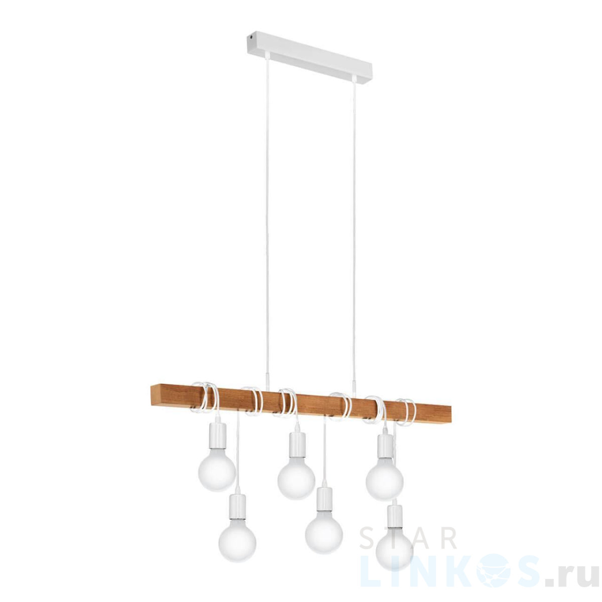 Поставщик рекомендует использовать лампы накаливания с цоколем E27 для освещения площади 20 м2. Подвесной светильник Eglo Townshend 33165 в стиле лофт используется в интерьере кухни с установкой на потолок.