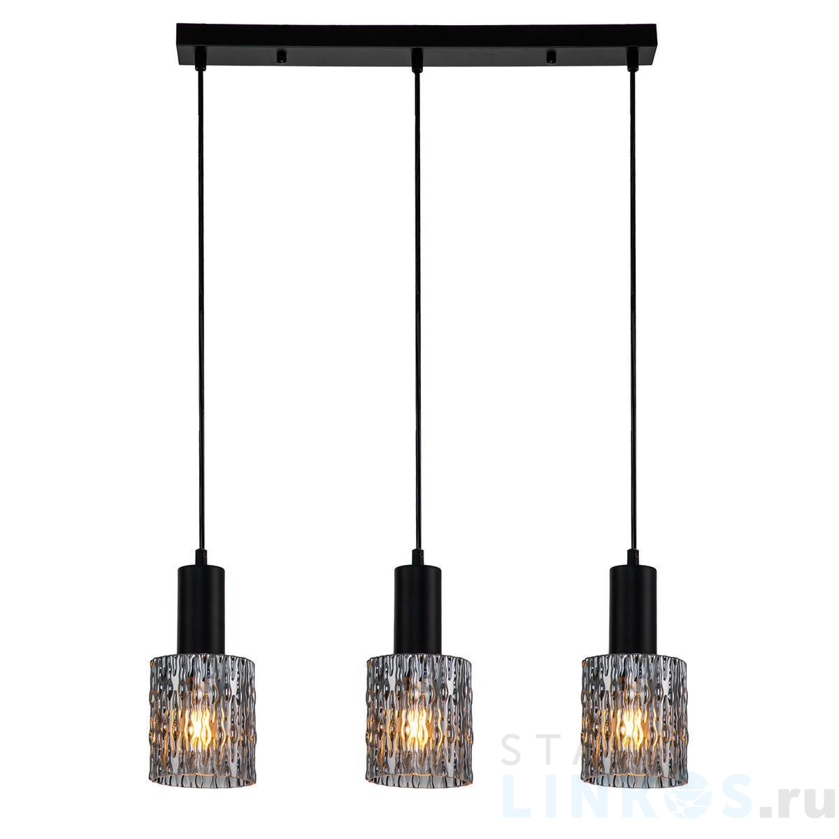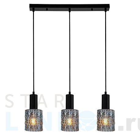 Поставщик рекомендует использовать лампы накаливания с цоколем E27 для освещения площади 7 м2. Подвесной светильник Escada Rain 10189/3S Black в стиле лофт используется в интерьере гостиной с установкой на потолок.