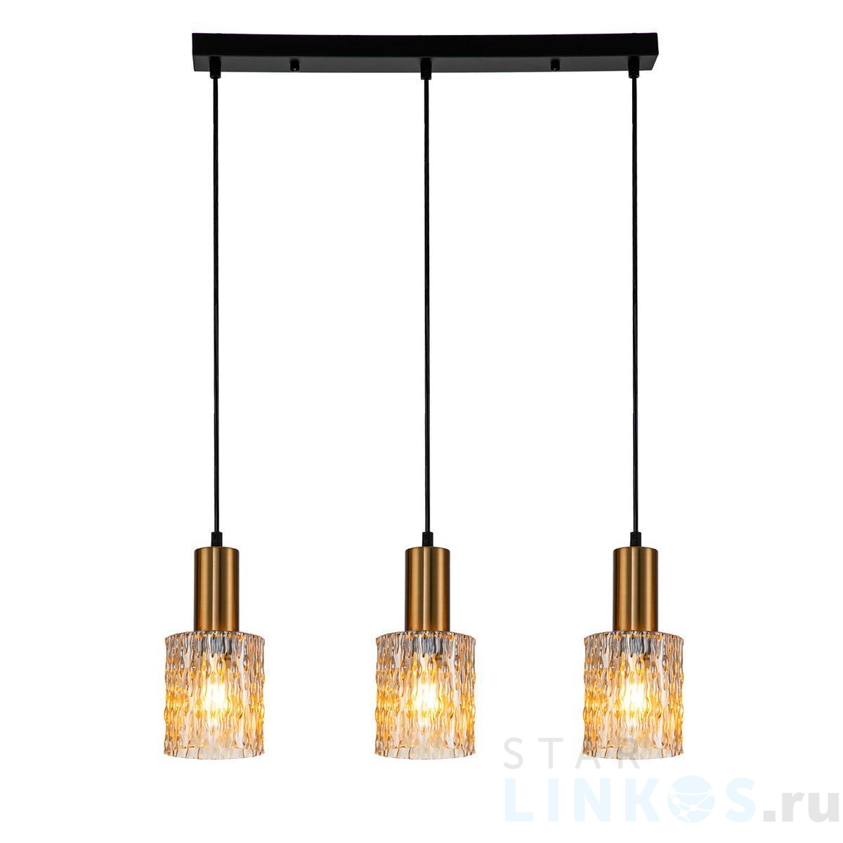 Поставщик рекомендует использовать лампы накаливания с цоколем E27 для освещения площади 7 м2. Подвесной светильник Escada Rain 10189/3S Brass в стиле лофт используется в интерьере гостиной с установкой на потолок.
