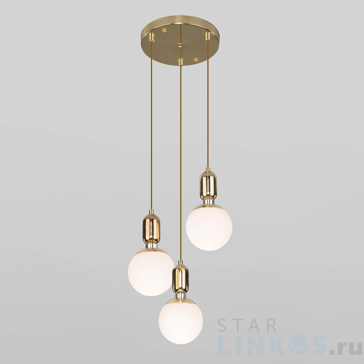 Поставщик рекомендует использовать лампы накаливания с цоколем E27 для освещения площади 6 м2. Подвесной светильник Eurosvet 50151/3 золото в современном стиле используется в интерьере гостиной с установкой на потолок.