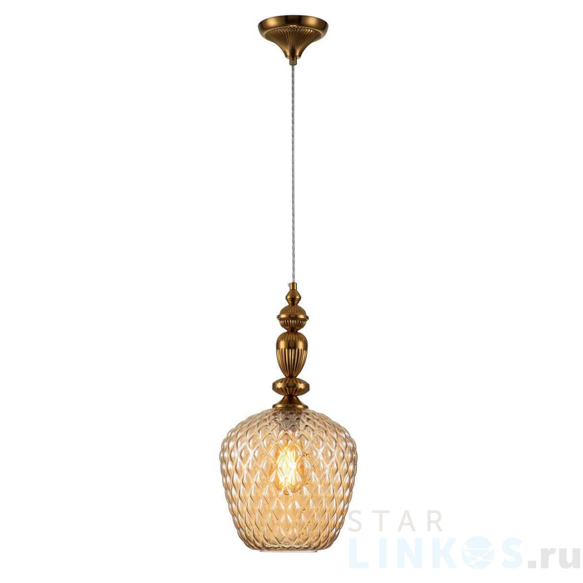 Поставщик рекомендует использовать лампы накаливания с цоколем E27 для освещения площади 3 м2. Подвесной светильник Indigo Annata 11010/1P Amber V000129 в классическом стиле используется в интерьере кухни с установкой на потолок.