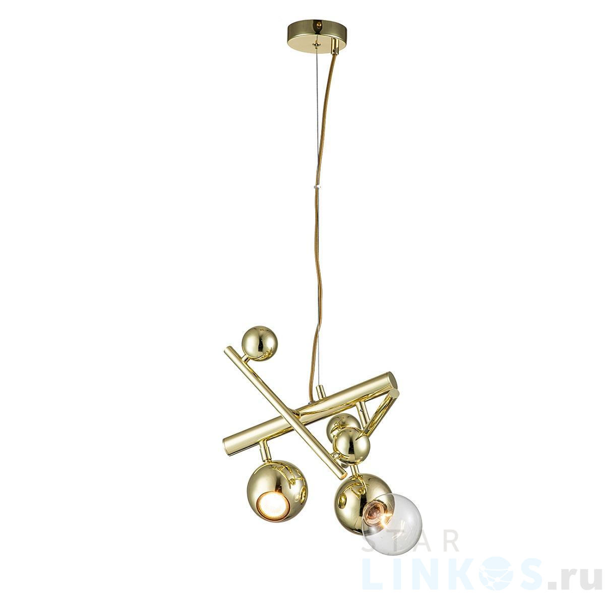 Поставщик рекомендует использовать лампы накаливания с цоколем E27 для освещения площади 6 м2. Подвесной светильник Indigo Saldo 11033/2P Gold V000334 в используется в интерьере гостиной с установкой на потолок.