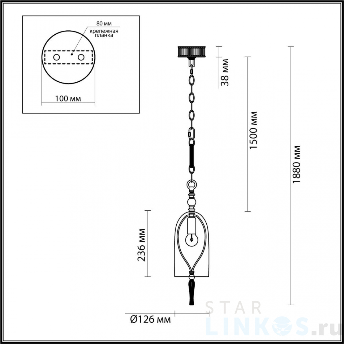 Поставщик рекомендует использовать лампы накаливания с цоколем E14 для освещения площади 2 м2. Подвесной светильник Odeon Light Neo Bell 4892/1 в используется в интерьере кухни с установкой на потолок.