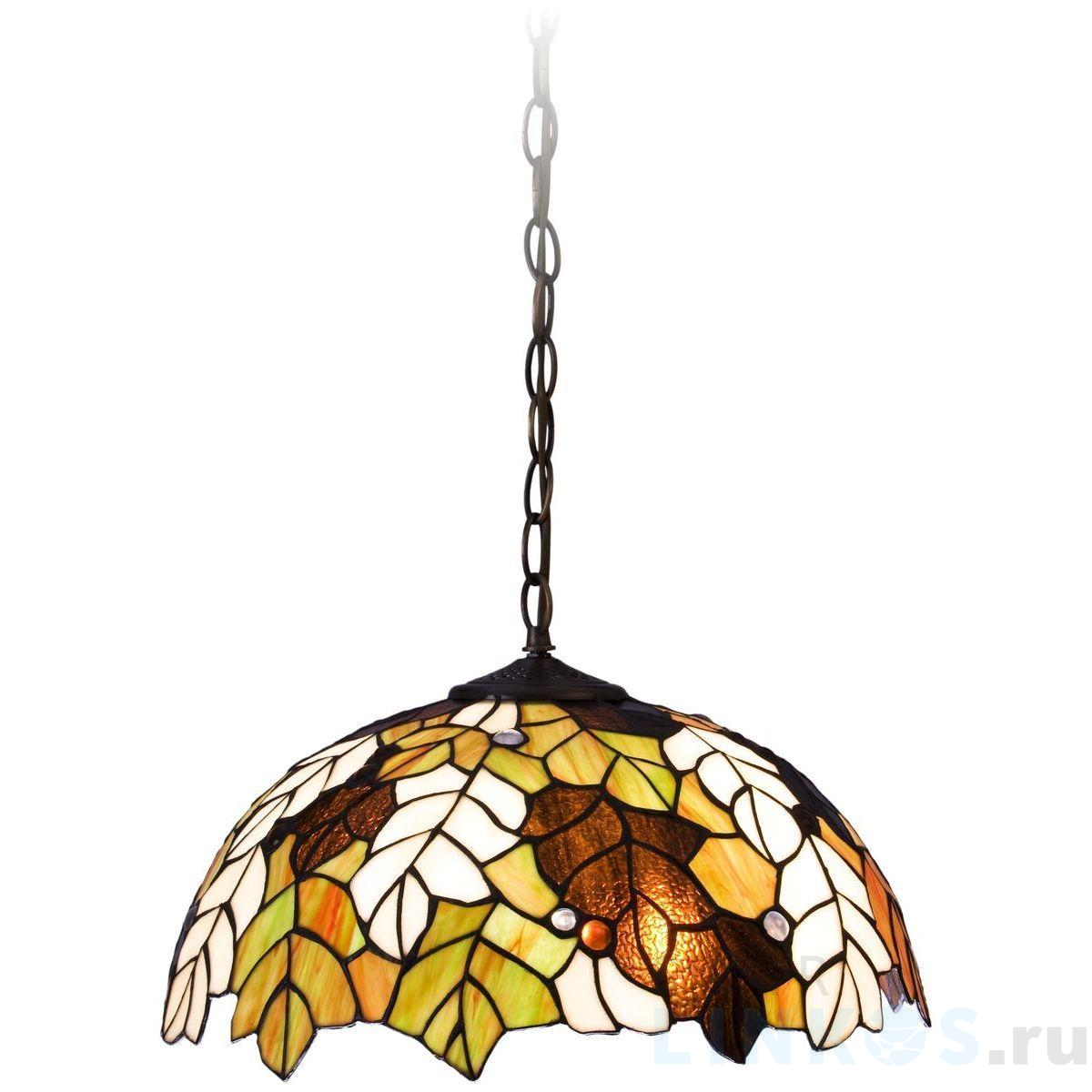 Поставщик рекомендует использовать лампы накаливания с цоколем E27 для освещения площади 6,7 м2. Подвесной светильник Velante 820-806-02 в стиле Тиффани используется в интерьере спальни с установкой на потолок.