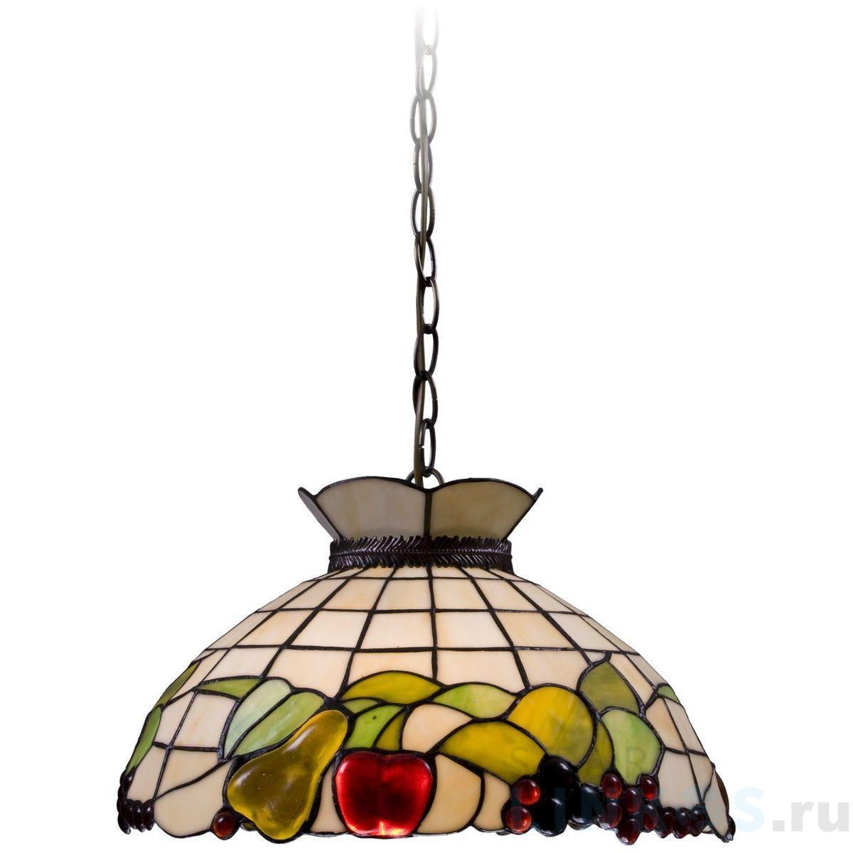Поставщик рекомендует использовать лампы накаливания с цоколем E27 для освещения площади 6,7 м2. Подвесной светильник Velante 850-806-02 в стиле Тиффани используется в интерьере кухни с установкой на потолок.
