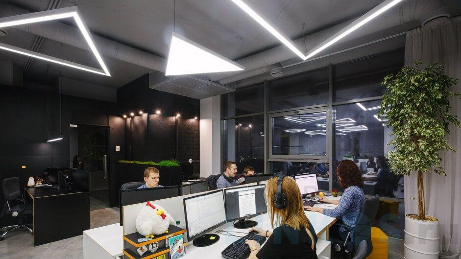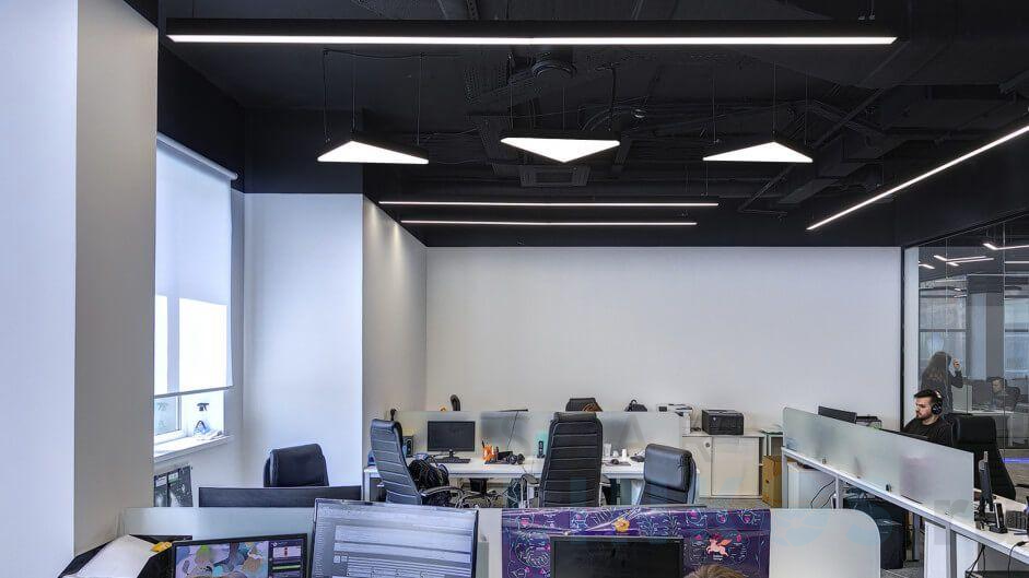 Подвесной светодиодный светильник Siled Trigon-Prof 7370354 в современном стиле используется в интерьере офиса с установкой на потолок.