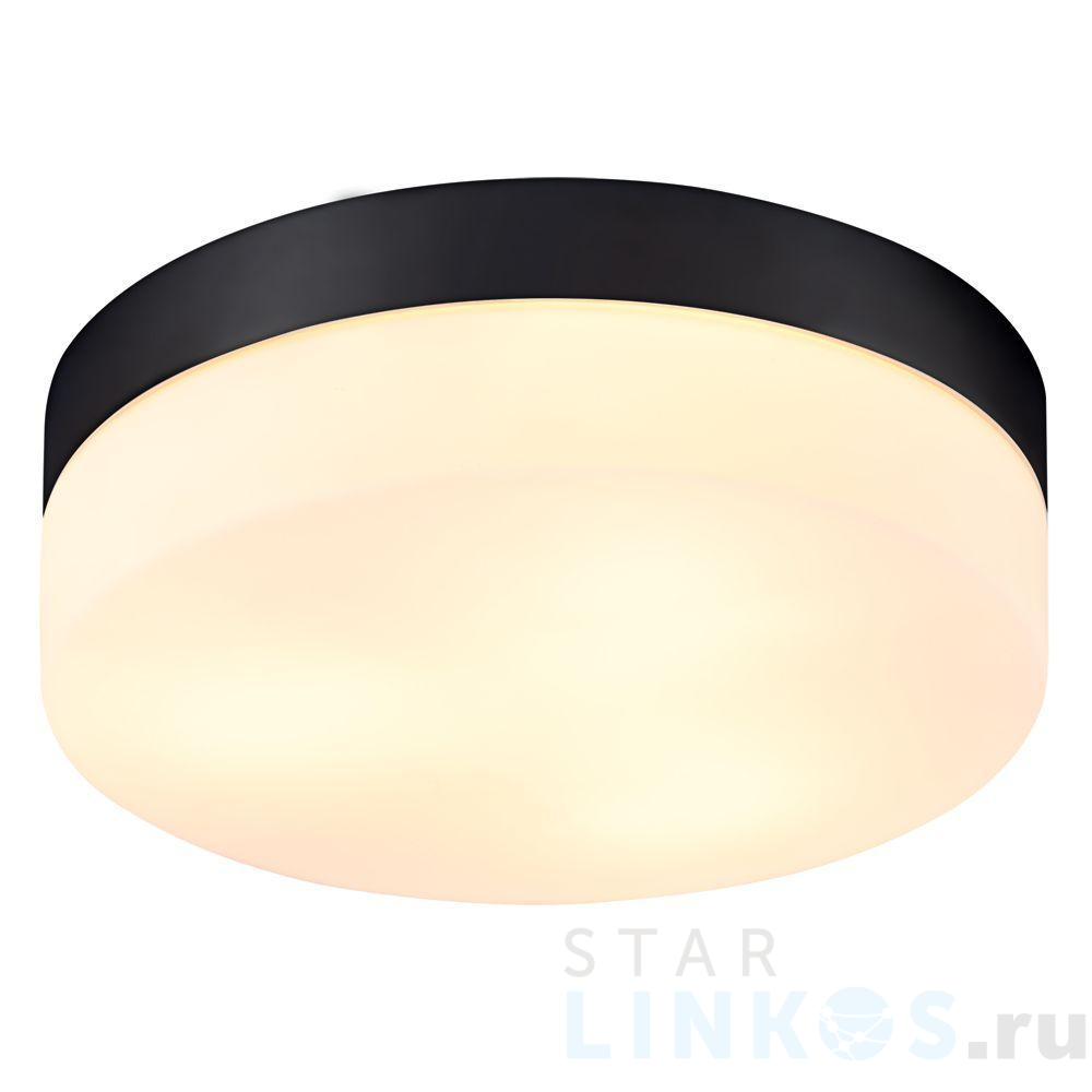 Поставщик рекомендует использовать лампы накаливания с цоколем E27 для освещения площади 7 м2. Потолочный светильник Arte Lamp Aqua-Tablet A6047PL-3BK в современном стиле используется в интерьере ванной с установкой на потолок.