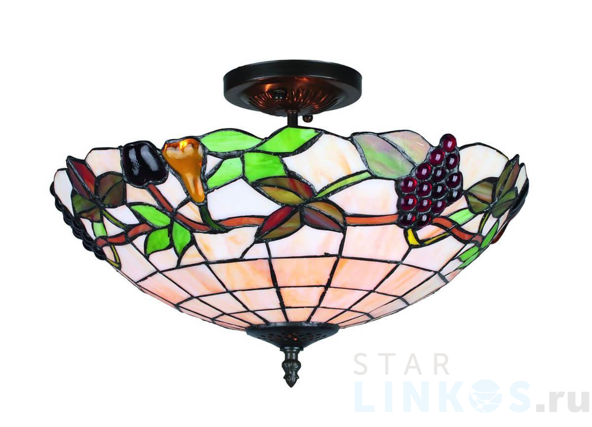 Поставщик рекомендует использовать лампы накаливания с цоколем E27 для освещения площади 10 м2. Потолочный светильник Omnilux OML-80307-03 в стиле Тиффани используется в интерьере кухни с установкой на потолок.