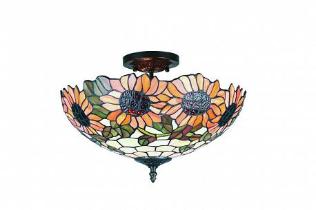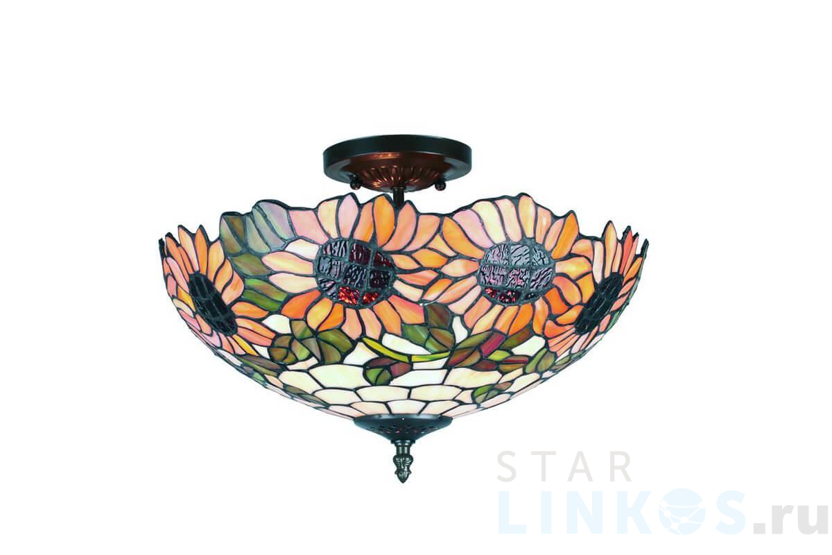 Поставщик рекомендует использовать лампы накаливания с цоколем E27 для освещения площади 10 м2. Потолочный светильник Omnilux OML-80407-03 в стиле Тиффани используется в интерьере кухни с установкой на потолок.