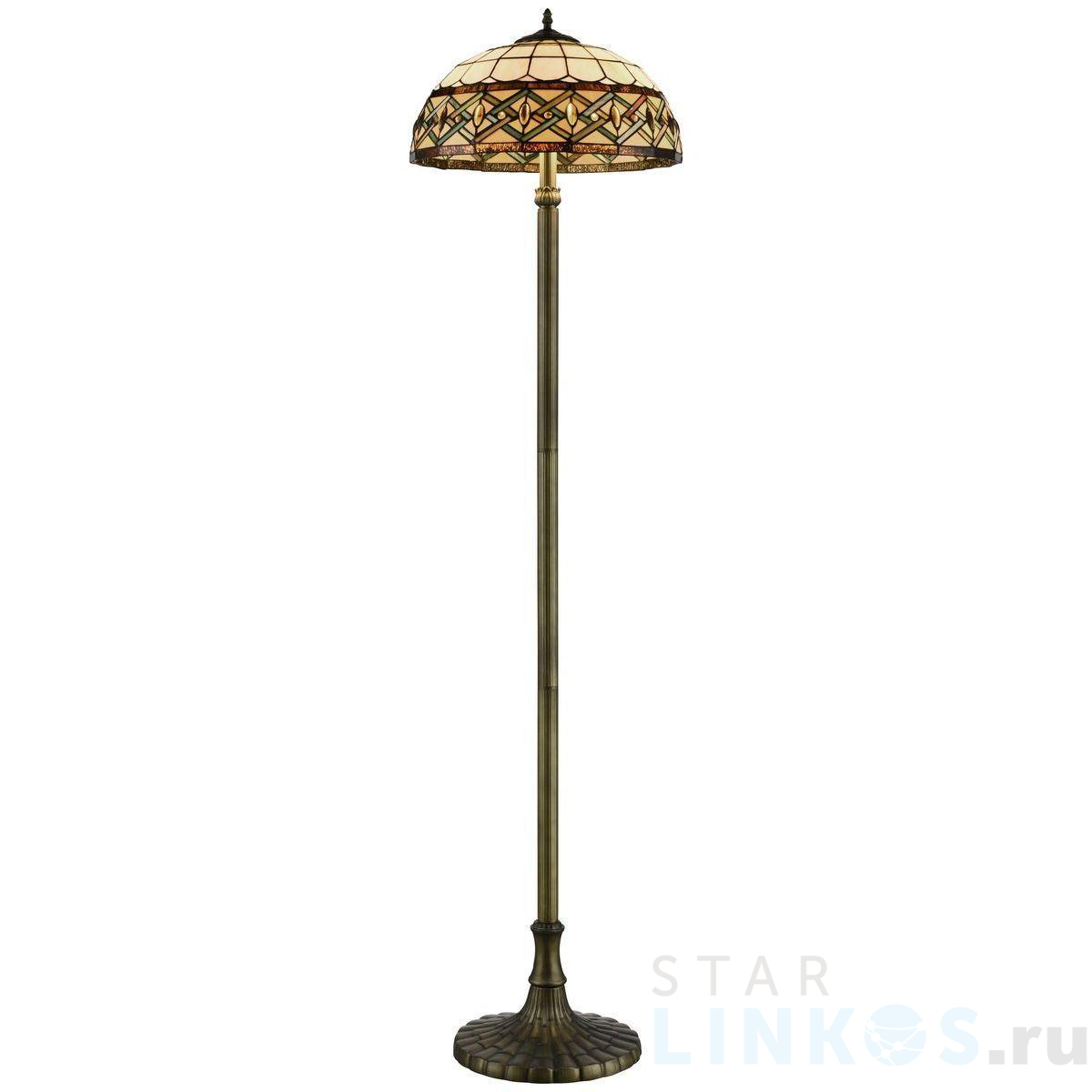 Поставщик рекомендует использовать лампы накаливания с цоколем E27 для освещения площади 6,7 м2. Торшер Velante 859-805-02 в стиле Тиффани используется в интерьере спальни с установкой на пол.