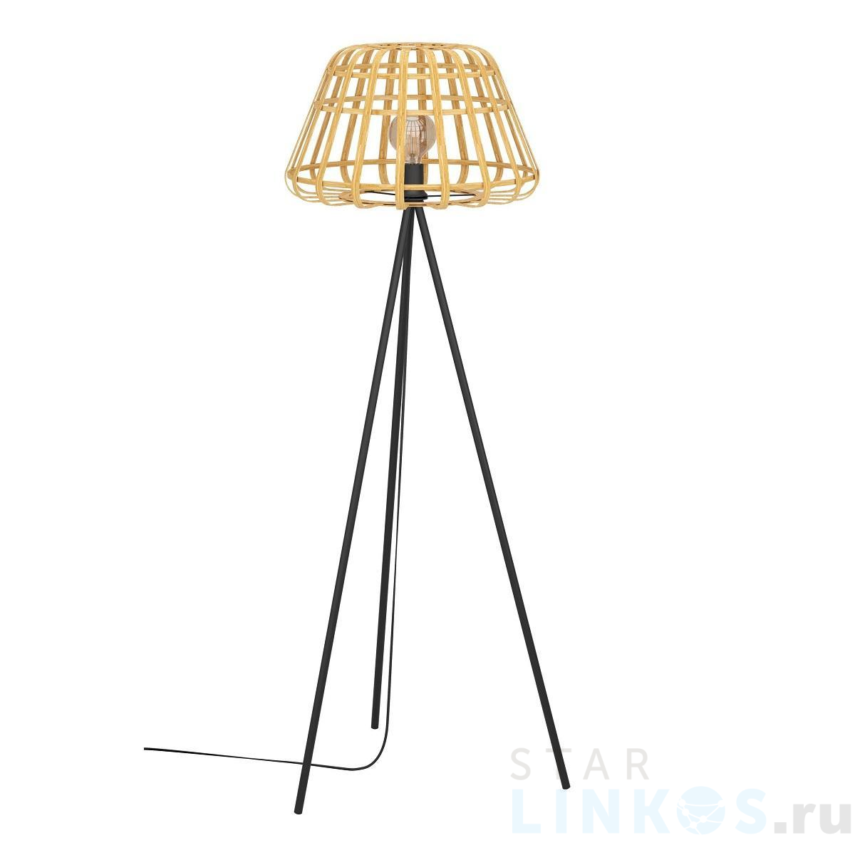 Поставщик рекомендует использовать лампы накаливания с цоколем E27. Торшер Eglo Montezuelo 390155 в кантри-стиле используется в интерьере спальни с установкой на пол.