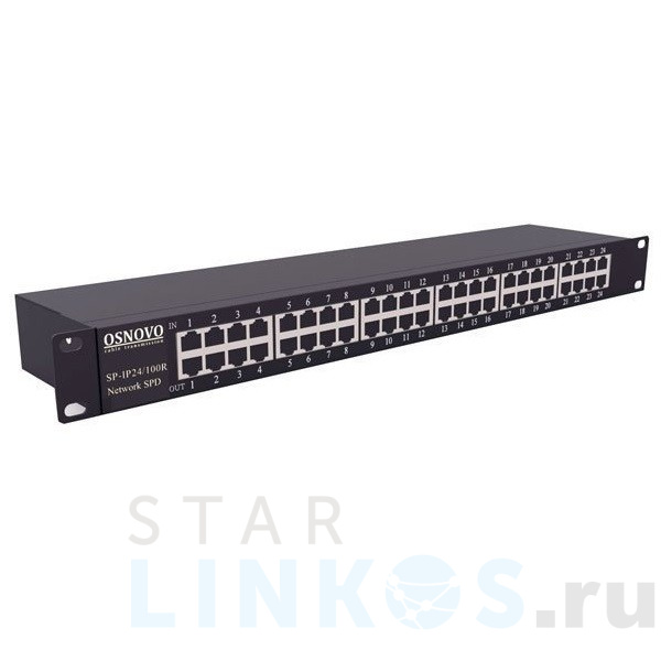 Устройство грозозащиты Osnovo SP-IP24/100R на 24 монтируют в 19-дюймовую стойку. Характеристики: Время срабатывания — не более 1 нс. Номинальный ток разряда линия — линия, линия — земля — 0.6/2.5 кА. Суммарный разрядный ток (8/20μs, линия — земля) — 10 кА. Номинальное напряжение — 5 В. Предельное длительное рабочее напряжение — 6 В. Полоса пропускания — 80 МГц. Интерфейсы SP-IP24/100R: по 24 порта RJ-45 (на входе и выходе), разъем подключения к заземляющему контуру. Рабочие температуры — –40 ºС... +80 ºC. Размер — 487×44.5×102 мм.