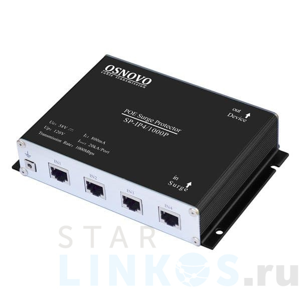 Устройство грозозащиты Osnovo SP-IP4/1000P оснащено гигабитными четырьмя RJ-45 на входе и четырьмя — на выходе, разъемом для подключения кабеля заземления. Характеристики: Передаваемая мощность РоЕ — до 75 Вт. Поддержка стандартов РоЕ — IEEE 802.3af и IEEE 802.3at. Время отклика — менее 1 нс. Полоса пропускания — 250 МГц. Номинальный ток разряда линия — земля и линия — линия— 2.5 кА. Суммарный разрядный ток (линия — земля) — 20 кА. Номинальное напряжение — 48 В. Максимальное длительное рабочее напряжение — 58 В. Рабочие температуры — –40 ºС... +80 ºC. Предусмотрен настенный монтаж. Размер — 156×102×32 мм.
