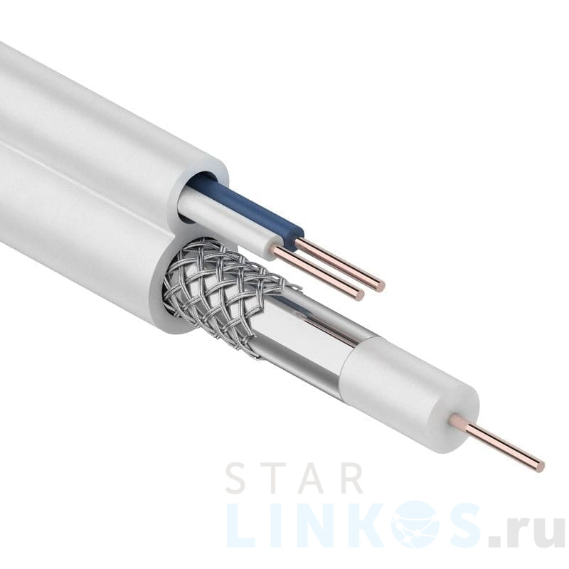 Коаксиальный комбинированный кабель Rexant 01-4001 (ККСВ-В+2×0.5) состоит из сигнального кабеля 3с-2v и двух питающих проводов, заключенных в общую оболочку в виде восьмерки.. Характеристики: Сердечник коаксиального кабеля — медный, монолитный. Изоляция сердечника — вспененный диэлектрик. Внешний проводник коаксиального кабеля — оплетка из алюминиевой проволоки. Токопроводящие провода — монолитные, медные. Диаметр токопроводящих проводов — 0.5 мм. Оболочка коаксиального кабеля, токопроводящих проводов и наружная — ПВХ. Длина кабеля в бухте — 100 м.