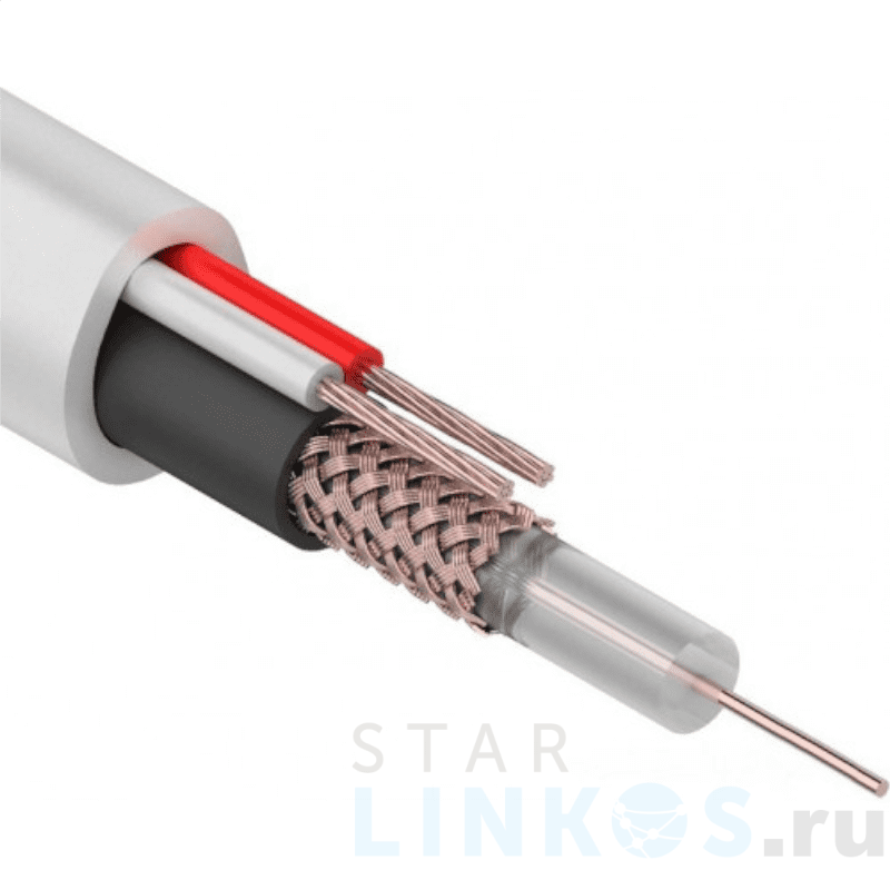 Коаксиальный комбинированный кабель КВК-В-1.5 + 2×0.50, коаксиальный кабель (аналог РК 75-1.5): одножильный, Cu/Cu (экран 48×0.1 мм — 72 %), полиэтилен; 2 питающих многожильных провода сечением 0.5 мм², ПВХ; общая оболочка — ПВХ, Ø6.3 мм, белый, 200 м.