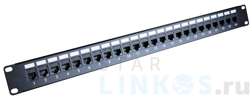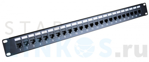 Патч панель на 24 порта RJ-45 CAT.5e 19”, CADENA предназначена для устройства структурированной кабельной системы. На лицевой стороне - 24 соединительных разъема, на обратной стороне - контакты для соединения с кабелем. Подключение абонентских кабелей к панели осуществляется посредством врезного контакта через IDC разъемы. На передней стороне панели стандартные порты типа RJ-45, собранные в группы по 6 портов.
