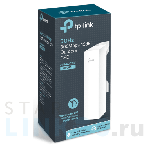 Точка доступа Wi-Fi TP-Link CPE510 предназначена для беспроводного подключения устройств и передачи данных на расстояние свыше 15 км. Корпус соответствует коду защиты от пыли и влаги IPX5. Предусмотрена защита от удара молнии — до 6 кВ и электростатического разряда — до 15 кВ. Интервал рабочих температур — -40 ºС… +70 ºС. Стабильно функционирует при сильном ветре. В основу модели заложен процессор 560 МГц, MIPS 74Kc. Характеристики: Скорость Wi-Fi — до 300 Мбит/с на 5 ГГц. Стандарты: при включенном Pharos MAXtream — TDMA, при отключенном Pharos MAXtream — IEEE 802.11a/n. Выбор ширины канала — 5/10/20/40 МГц. Мощность передачи (EIRP) — регулируемая, до 20 дБм или 100 мВт. Рабочие режимы модели: точка доступа, ретранслятор, клиент, точка доступа с маршрутизатором, точка доступа и беспроводной клиент-маршрутизатор WISP. Для работы в сетях с разграниченным по уровням допуском предусмотрена функция Multi-SSID (тегирование VLAN, только а режиме точки доступа). Безопасность передачи данных обеспечивают алгоритмы шифрования и аутентификации пользователей — WPA/WPA2, WPA-PSK/WPA2-PSK (AES/TKIP). Устройство поддерживает: Pharos Control — централизованную утилиту для управления всеми IP-устройствами с одного компьютера. Технологию TP-LINK Pharos MAXtream — доступ множества клиентов с разграничением по времени для предупреждения несогласованности точки доступа и базовых станций, что стабилизирует на высоком уровне пропускную способность, увеличивает производительность, снижает время ожидания. Технологию Passive PoE. CPE510 оснащена встроенной антенной (метод передачи 2×2 MIMO) с одновременной работой в вертикальной и горизонтальной поляризациях, усилением 13 дБи и металлическим экранированием, обеспечивающими высокую пропускную способность и низкий уровень шума. Укомплектована портом Ethernet (LAN/POE), разъемом для заземления. В поставку дополнительно включены: комплект для монтажа на мачту, кабель питания, адаптер Passive PoE (выходное напряжение DC 16 ~ 27 В) для питания устройства на расстоянии до 60 м по LAN. Размеры устройства — 224×79×60 мм, адаптера — 110×57×33.5 мм.