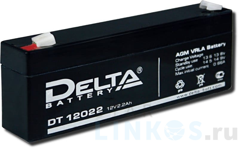 Герметичный свинцово-кислотный аккумулятор Delta DT 12022 произведен по технологии AGM: серная кислота между электродами находится не в жидком состоянии, а в абсорбированном. В качестве абсорбера выступает микропористый стекловолоконный заполнитель. Такое решение увеличивает ресурс и безопасность работы за счет устранения возможности утечки электролита и взрыва. АКБ стабильно работает в условиях вибрации. Предусмотрен клапан, сбрасывающий излишки газа при критическом давлении. Высокая рекомбинация газа (до 99 %) обеспечивает ненужность долива воды при эксплуатации. Характеристики: Номинальное напряжение — 12 В DC. Номинальная емкость — 2.2 А·ч. Число элементов — 6. Буферный режим (постоянная подзарядка) — напряжение заряда 2.3 В/элемент. Циклический режим (периодическая зарядка) — максимальный зарядный ток — 0.66 А, напряжение заряда 2.45 В/элемент. Максимальный разрядный ток (до 5 с., при 25 ºС) — 44 А. Медные клеммы. Тип клеммы — Faston (зажим) 6.35 мм. Саморазряд — 3 % емкости в месяц при 25 ºС. Срок службы — до 5 лет. Рабочие температуры: разрядки — –15 ºС… +50 ºC, зарядки — –10 ºС… +50 ºC, рекомендуемые (сохранение номинальных параметров, продолжительный ресурс) — +20 ºС… +25 ºС. Корпус и крышка изготовлены из ABS-пластика. Размер — 178×35×60 мм. Высота по выводам — 66 мм. Вес — 970 г.