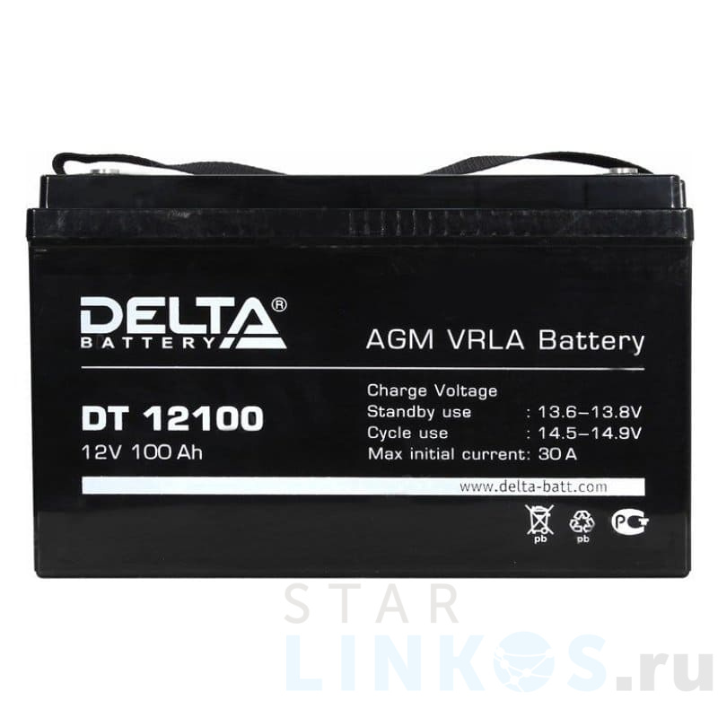 Аккумулятор Delta DT 12100 реализован в технологии AGM: раствор соляной кислоты абсорбирован микропористым сепаратором из стекловолокна, расположенным между свинцовыми, легированными кальцием, пластинами. Для выброса избыточного газа при критическом давлении предусмотрен предохранительный клапан из каучука. Конструкция исключает риск утечки электролита и коррозию клемм, обеспечивает высокую работоспособность в условиях вибрации, перевозку АКБ в любом положении. Характеристики: Тип — герметичный свинцово-кислотный, необслуживаемый. Номинальное напряжение — 12 В DC. Емкость — 100 А·ч. Число элементов — 6. Максимальный разрядный ток при 25 ºС (≤5 с.) — 1000 А. Высокая рекомбинация газа — до 99 % (без долива дистиллята до выработки ресурса). Саморазряд в месяц при 25 ºС — 3 % емкости. Низкое внутреннее сопротивление полностью заряженной батареи (при 25 ºС) — 4.5 мОм. Тип клеммы — под болт с гайкой Ø8 мм. Материал клемм — медь. DT 12100 поддерживает работу в буферном (постоянная подзарядка, напряжение заряда 2.3 В/элемент) и циклическом (периодическая зарядка, максимальный ток заряда — 30 А, напряжение заряда 2.45 В/элемент) режимах. Срок службы — 7 ~ 10 лет (буферный режим), 1100 циклов при разрядке до 30 % (циклический режим). Корпус и крышка — пластик ABS. Рабочие температуры: разрядки — –15 ºС… +50 ºC, зарядки — –10 ºС… +50 ºC, рекомендуемые — +20 ºС… +25 ºС (длительный ресурс при сохранении номинальных параметров). Перевозка — любым видом транспорта. Размер — 329×172×215 мм, высота по клеммам — 219 мм. Вес — 31 кг.