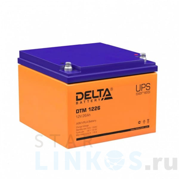 Аккумулятор Delta DTM 1226 с повышенными разрядными характеристиками реализован в технологии AGM: состоит из электродов и расположенного между ними микропористого стекловолоконного заполнителя с удерживаемой на капиллярном уровне серной кислотой. Для автоматического удаления газа при критическом давлении снабжен клапаном. Конструкция препятствует утечке электролита, обеспечивает устойчивость к вибрациям, исключает риск взрыва. За счет рекомбинации газа до 99 % доливать воду не нужно. Характеристики: Тип — VRLA: свинцово-кислотный герметичный. Емкость — 26 А·ч. Номинальное напряжение — 12 В DC. Число элементов — 6. Предельный разрядный ток при 25 ºС (не более 5 с.) — 300 А. Саморазряд — 3 % емкости в месяц при 20 ºС. Внутреннее сопротивление заряженной батареи при 25 ºС — 10 мОм. Материал клемм — медь. Подключение клемм — под болт M5. DTM 1226 работает в буферном (с постоянной подзарядкой, напряжением заряда 2.27 В/элемент) и в циклическом (с периодической зарядкой, максимальным током заряда 7.8 А, напряжением заряда 2.35 В/элемент) режимах. Температура разрядки — –20 ºС… +60 ºC, зарядки — –10 ºС… +60 ºC. Для длительной работы с сохранением номинальных параметров рекомендована эксплуатация при температурах +20 ºС... +25 ºС. Корпус и крышка выполнены из ABS-пластика. Срок службы: 6 лет — для буферного режима, 1100 циклов при 30-процентной разрядке — для циклического. Перевозка — любым видом транспорта. Размер — 166×175×125 мм. Вес — 9.2 кг.
