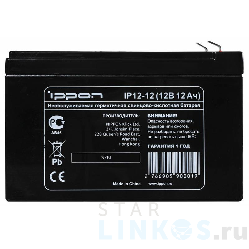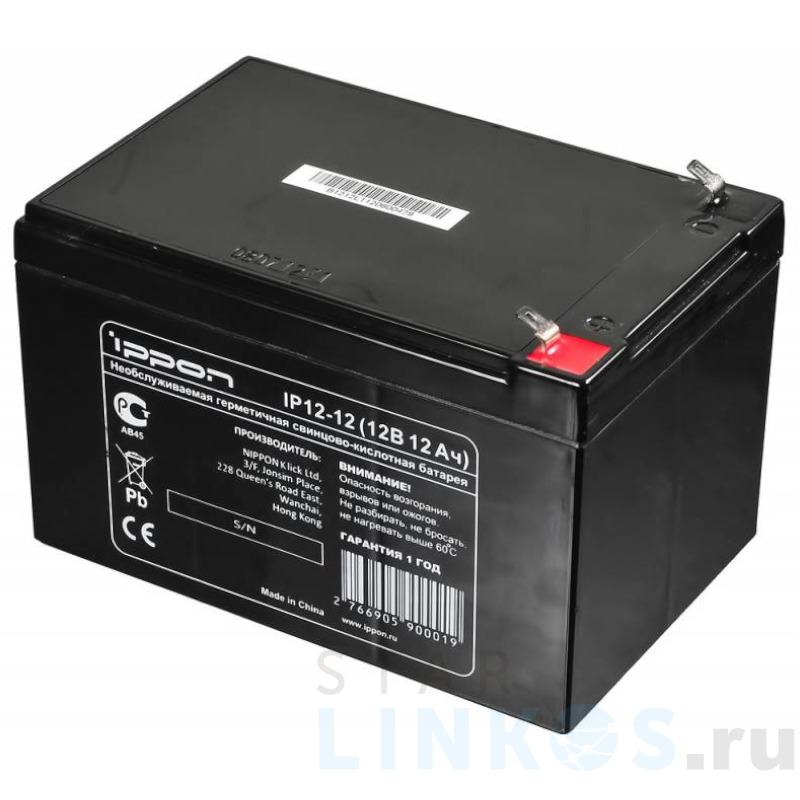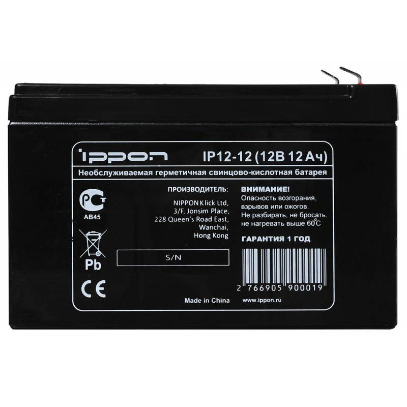 Батарея Ippon IP12-12 предназначена для обеспечения аварийного и резервного питания устройств, подключенных к ИБП систем охраны и безопасности, автоматизированного управления, охранной сигнализации, аварийного освещения, телекоммуникационного оборудования. Тип АКБ — необслуживаемая герметичная свинцово-кислотная. Емкость — 12 А·ч, напряжение питания — 12 В (постоянный ток).