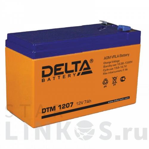 Аккумулятор DTM 1207, Delta, герметичный свинцово-кислотный (Оранжевый), Емкость аккумулятора: 7,2 Ач, Номинальное напряжение: 12 В, Хранение: -20…+60°С, Заряд: -10…+60°С, Разряд: -20…+60°С, Размеры: 151х65х94 мм