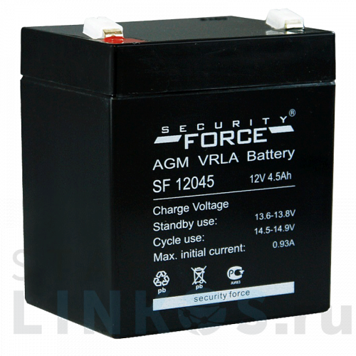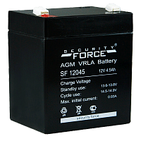 Аккумулятор SF 12045, Security Force, стационарный свинцово-кислотный, Емкость аккумулятора: 4,5 Ач, Номинальное напряжение: 12 В, Хранение: -20...+50°C, Заряд: -10...+50°C, Разряд: -15...+50°C, Размеры: 90х70х107 мм