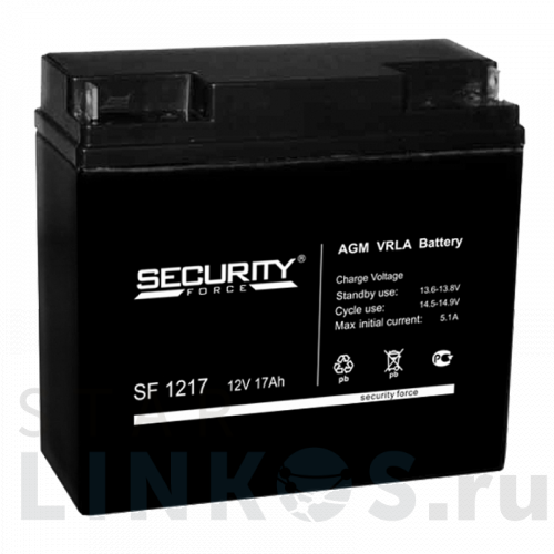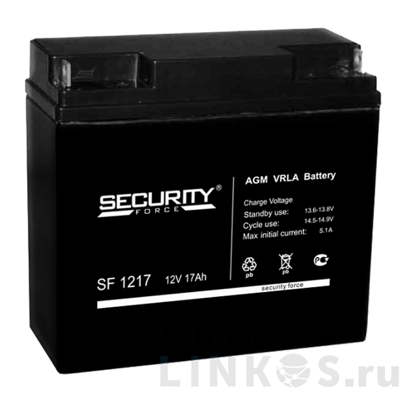 Аккумулятор SF 1217, Security Force, стационарный свинцово-кислотный, Емкость аккумулятора: 17 Ач, Номинальное напряжение: 12 В, Хранение: -20...+50°C, Заряд: -10...+50°C, Разряд: -15...+50°C, Размеры: 182х76х167 мм