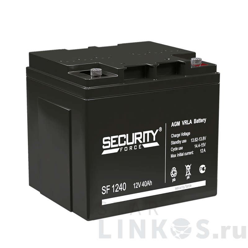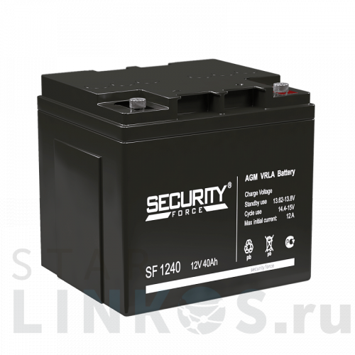 Аккумулятор SF 1240, Security Force, стационарный свинцово-кислотный, Емкость аккумулятора: 40 Ач, Номинальное напряжение: 12 В, Хранение: -20…+50°C, Заряд: -10…+50°C, Разряд: -15…+50°C, Размеры: 195х165х175 мм