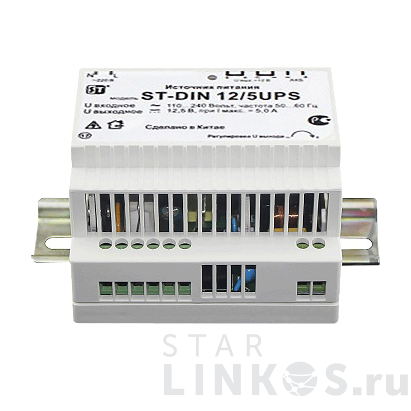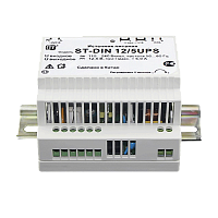ST-DIN 12/5UPS, Стабилизированный источник питания на DIN-рейке с функцией подключения АКБ для питания аппаратуры напряжением 12В, Ток нагрузки рабочий/максимальный: 5,0А, Выходное напряжение, номинальное: 12,5В, Максимальный ток заряда АКБ: 0,7А, Ток ограничения выхода при коротком замыкании нагрузки: >6,0А, Защита выхода от КЗ с восстановлением нормального режима работы после устранения проблемы,защита АКБ от глубокого разряда,регулировка выходного напряжения, Емкость АКБ: рекомендуемая емкость подключаемого АКБ (напряжением 12 Вольт с электрической емкостью 7 или 12 А/ч), Температура эксплуатации: -10...+45°C