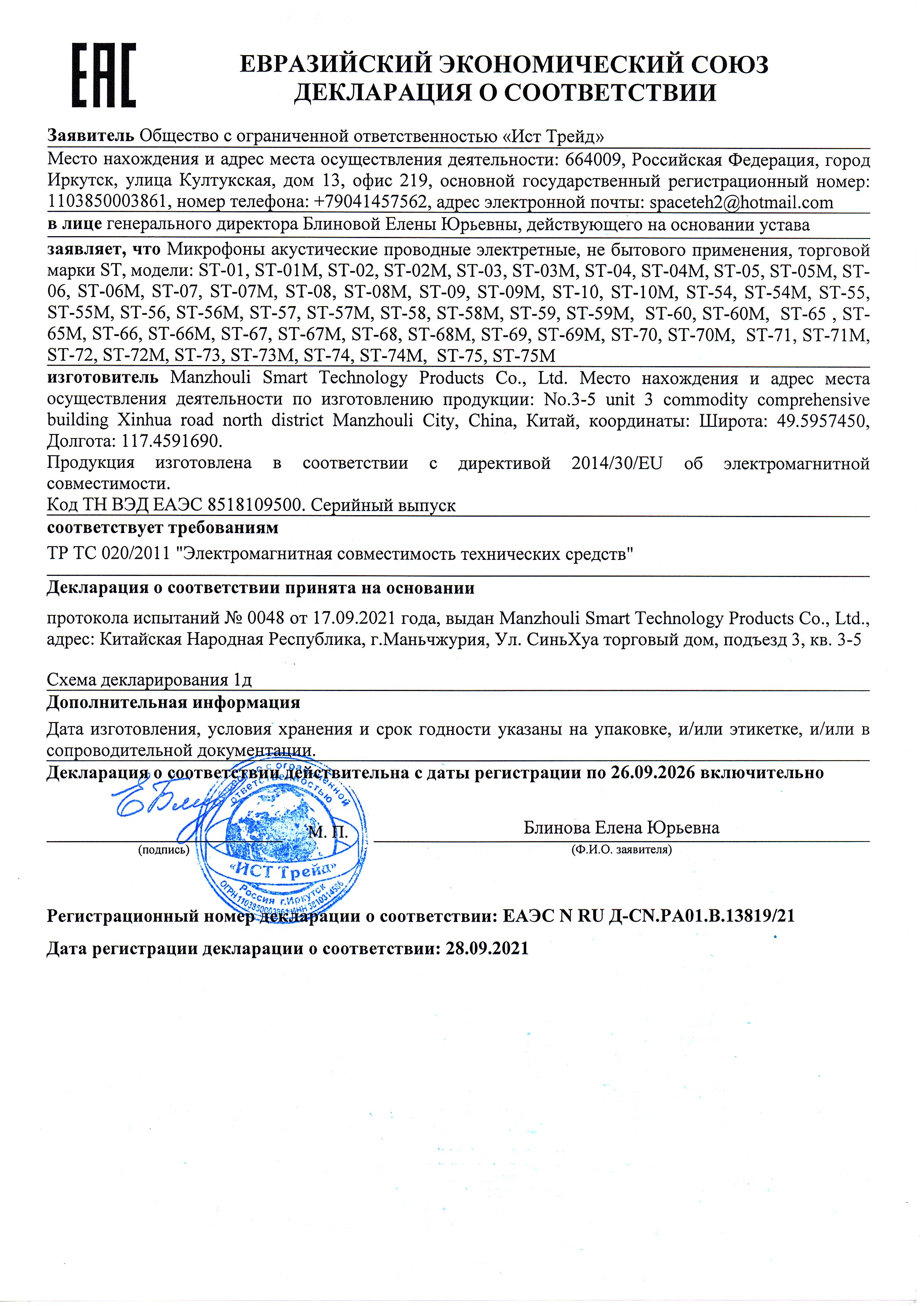 Микрофон ST-02М, электретный, Номинальное рабочее напряжение питания, постоянное, стабилизированное: 3...10 В, Ток потребления: 0,05 А, Полоса частот (от и до): 100...10 000 Гц, Максимальное расстояние передачи сигнала по проводной линии связи, сечение: не менее 50, Акустическая дальность: до 7 м, Габариты микрофона: 5х10 мм, Рабочая температура: -40…+50°С, ПЛАСТИК