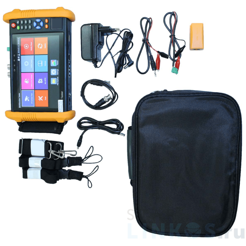 Тестер аналоговых и IP-видеосистем, 7" 1280×800, Wi-FI 150 Мбит/с, до 5 Мп, измеритель оптической мощности, тестер оптических линий, UTP-кабеля, кабельной трассы, локатор COAX/UTP кабеля, генератор тестовых таблиц, запись и воспроизведения аудио и видео, проверка IP-сетей, рефлектометр (BNC, RJ-45), RTSP, измерение РоЕ, PTZ-управление, мониторинг RS-485, БП камер DC 12 В, 2 А, DC 5 В, 2 A (USB), PoE (48 В, 24 Вт), 3×RJ-45, HDMI вход и выход, 4×BNC, 2×FC, RS-485, аудио-вход-выход, вход/выход DC, USB-выход (5 В, 2 A), слот MicroSD, SD-карта на 8 Гбайт, мультиметр, клеммы для щупов мультиметра, батарея Li-Pol 7.4 В, 5000 мА·ч, -10 ºС… +50 ºС.