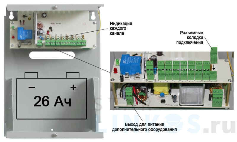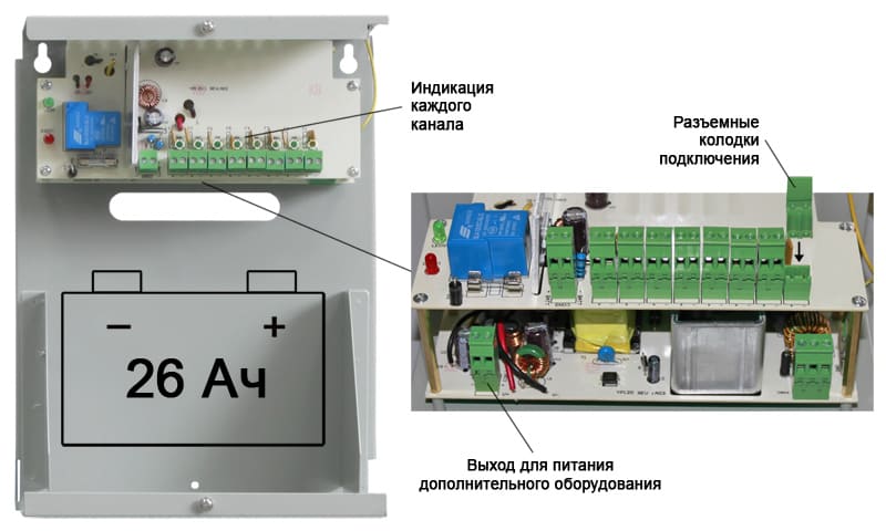 На 8 устройств по 0.5 А и 1 на 4 А Напряжение сети 150 В ~ 250 В AC Напряжение на выходе 12 В DC АКБ 12 В, 26 А·ч (не в комплекте) Комплексная защита